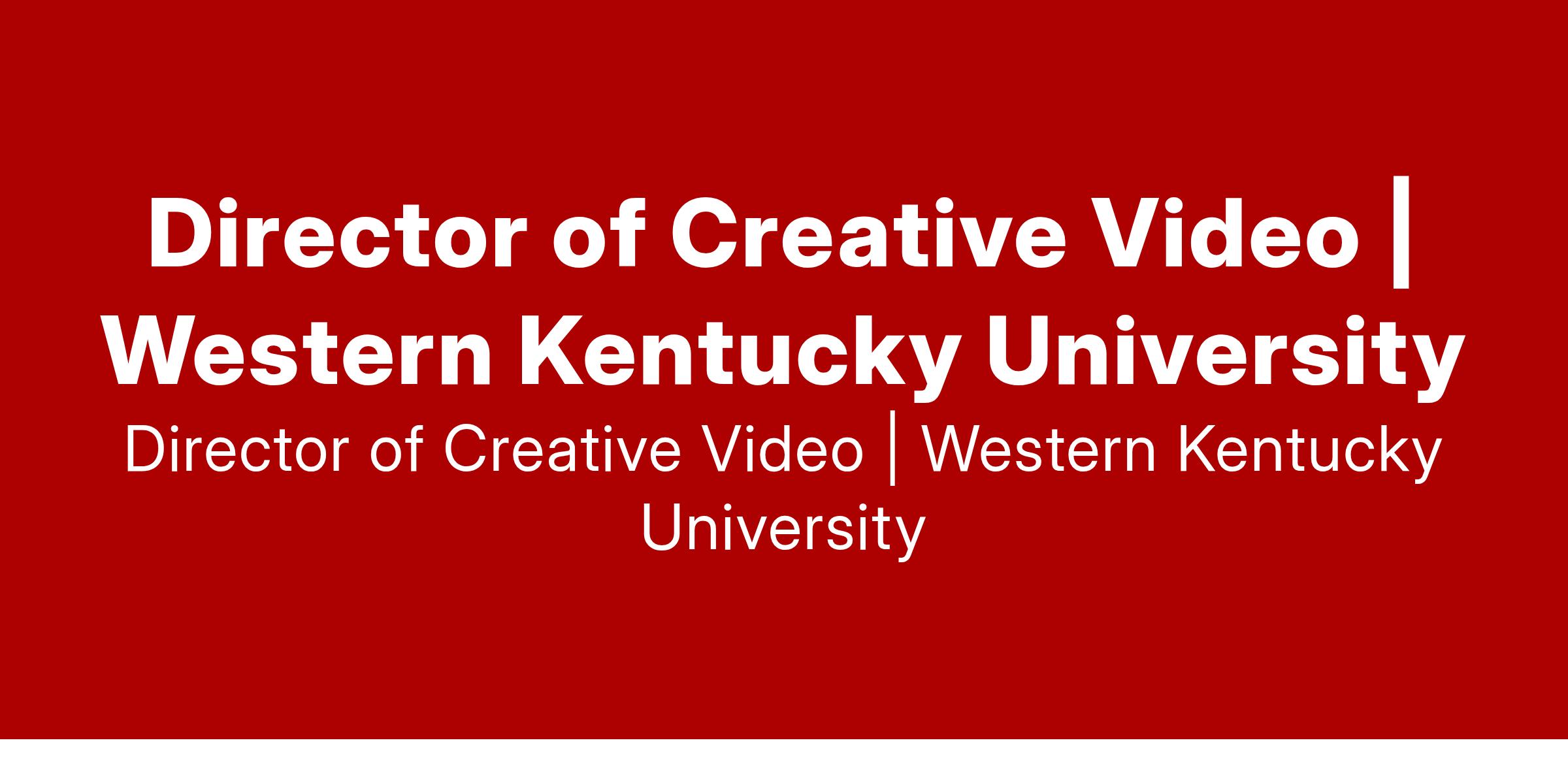 Bowling Green, Kentucky, WKU seeks applicants for the position of Director of Creative Video . Reporting to the Senior Associate Athletic Director for Communications/Marketing, in partnership with WKU Public Media, this position is responsible for visualizing, producing, shooting, editing and delivering high-energy video and motion content for WKU Athletics.