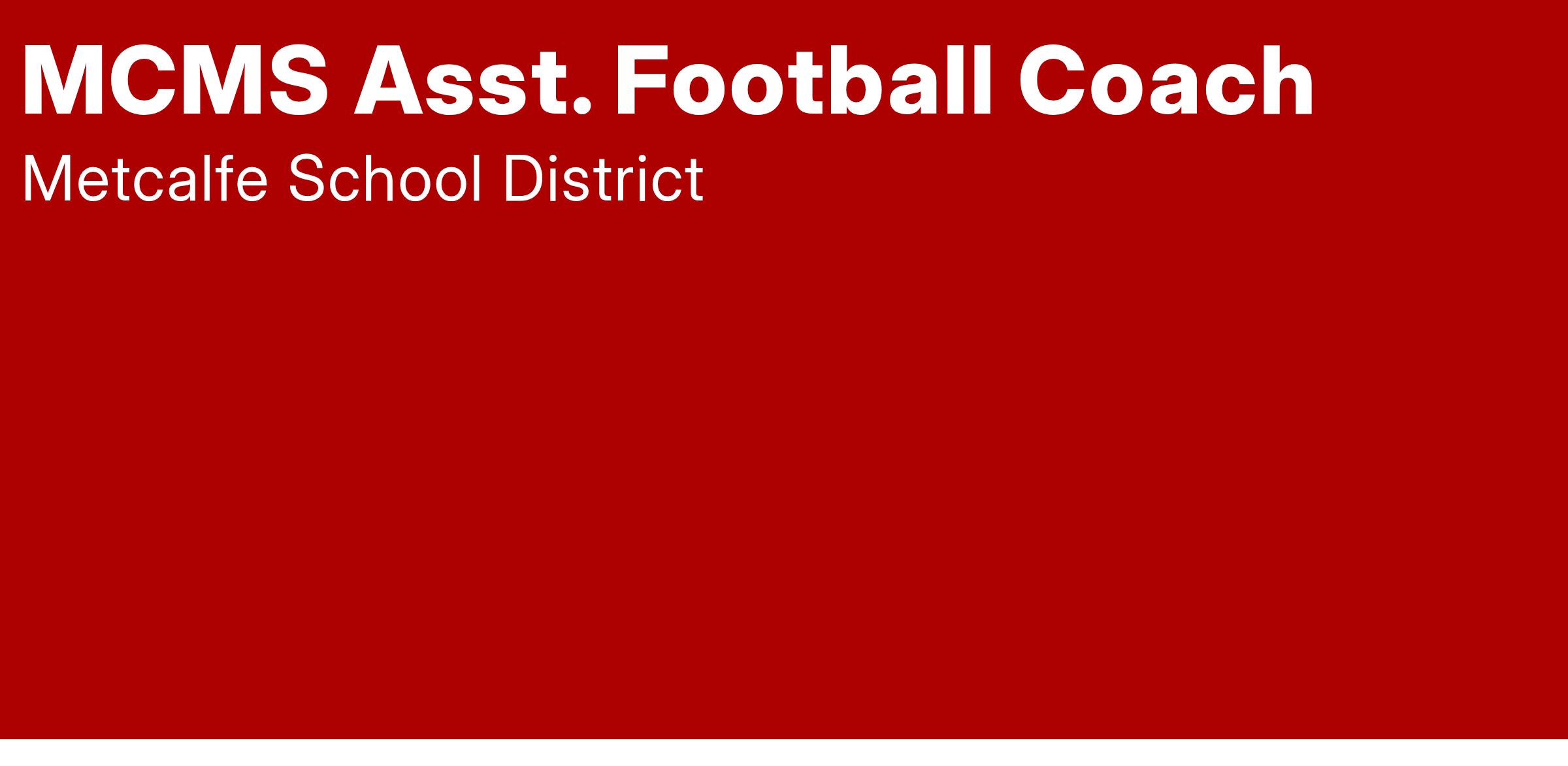 Metcalfe County Middle School is taking applications for Asst. Football Coach position for the 2025-2026 school year. A minimum of 2 years coaching experience is preferred. Thank you for your interest in Metcalfe County Schools. For additional questions, please contact Stacey Slinker at the district personnel office at (270)432-3171 or via email: stacey.slinker@metcalfe.kyschools.us