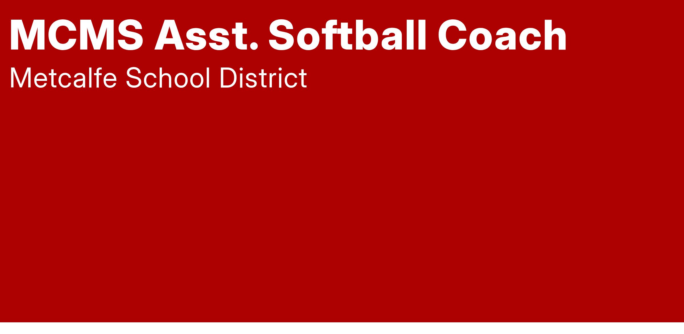Metcalfe County Middle School is taking applications for Asst. Softball Coach position for the 2025-2026 school year. A minimum of 2 years coaching experience is preferred. Thank you for your interest in Metcalfe County Schools. For additional questions, please contact Stacey Slinker at the district personnel office at (270)432-3171 or via email: stacey.slinker@metcalfe.kyschools.us
